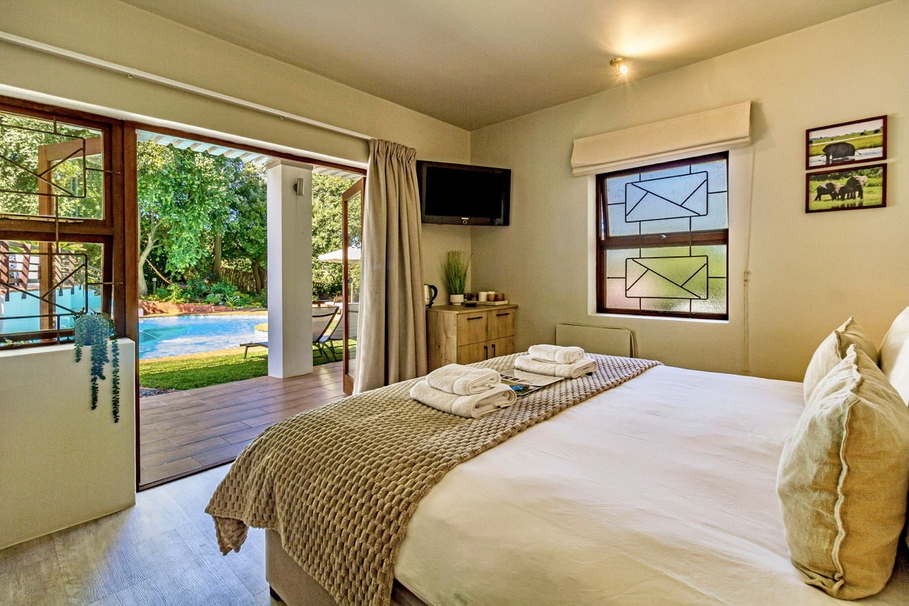 Double Room with beautiful Pool view, big King XL bed (separable), small seating area in the room, bathroom with rain shower, separate bath and complimentary toiletries, a SMART TV with DSTV, mini fridge, basic coffee and tea facilities and your own cozy patio.