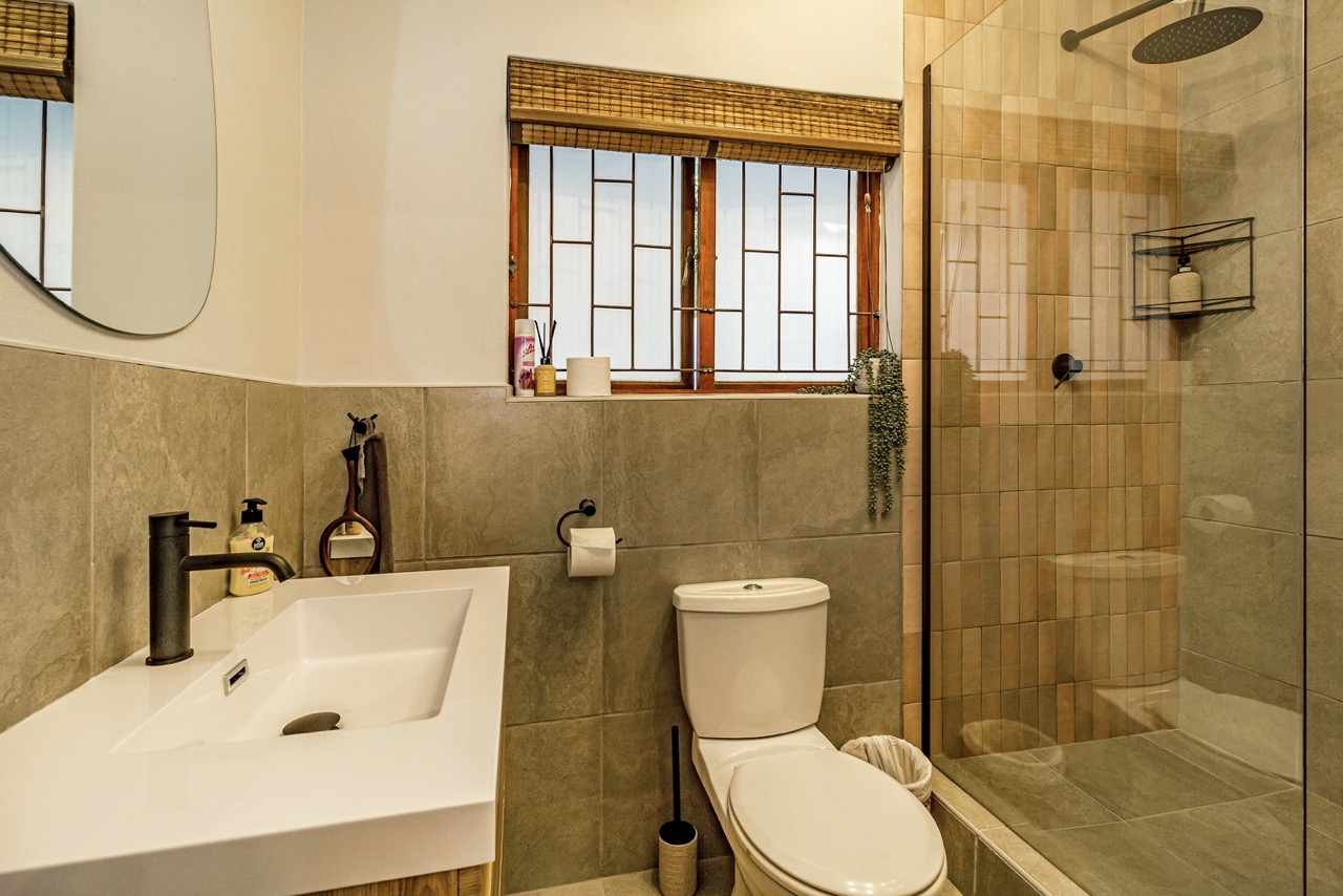 Spacious double Room on the upper floor with a Queen XL bed, airconditioning, small seating area in the room, bathroom with rain shower, a separate bath and complementary toiletries, a big SMART TV with DSTV, mini fridge and basic coffee and tea facilities.